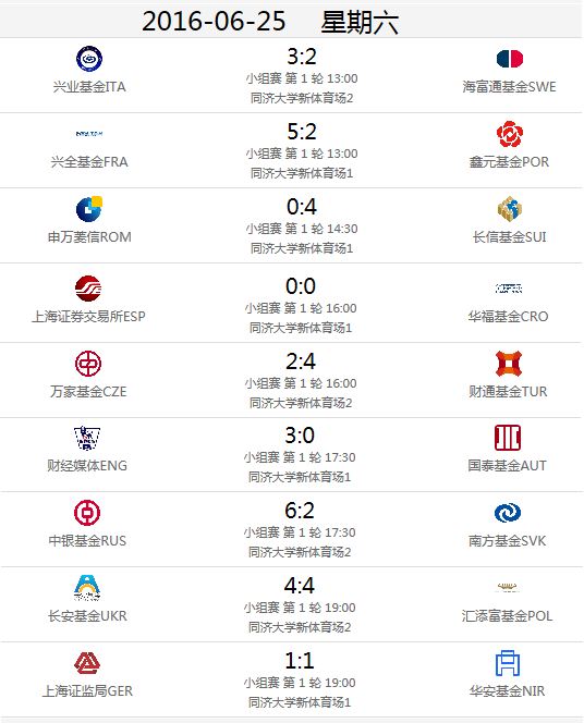 6月25日下午13:00,随着比赛哨声的响起,2016上海市基金同业公会“兴全基金杯”足球赛首轮小组赛在同济大学正式拉开战幕。绿茵场上,五个小组18支球队的运动员们在雨中展开耐力与意志的较量;场下,啦啦队后援团欢呼雀跃、呐喊助威不绝于耳。这让在场所有人真切感受到上海基金业努力向上、团结进取的精神风貌,共享竞技体育带来的魅力与欢乐。