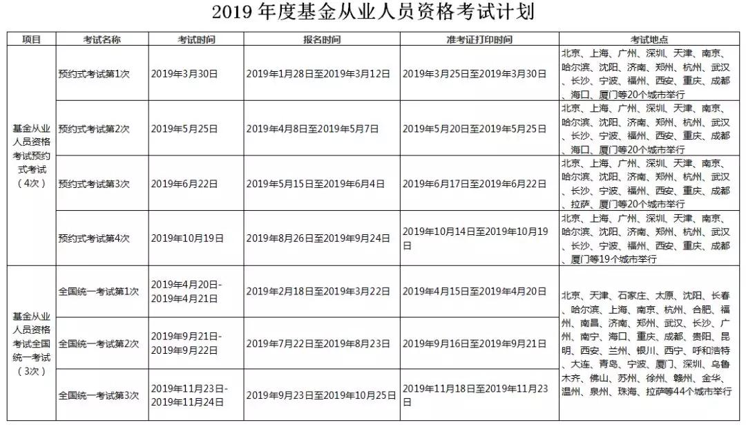 各机构: 中国证券投资基金业协会现将2019年度基金从业人员资格考试计划公开发布。基金从业资格考试包含全国统一考试、预约式考试,考试计划可将根据实际情况进行调整,具体报名时间、考试时间、准考证打印时间和考试地点以当期考试公告为准。考生可通过中国证券投资基金业协会网站从业人员管理栏目考试平台查阅考试信息。